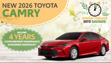 Tax, Title, Tags and $998 dealer fee not included in vehicle prices shown and must be paid by the purchaser. For only very well qualified customers. Lease example based on 2026 Camry 2WD 4Dr. Sedan LE Hybrid CVT Model 2559 with Total SRP of $30,160. $4,258 Due At Signing includes $3,304 customer down payment, first month's payment of $259, and $695 Acquisition Fee. Tax, Title, Tags and $998 dealer fee not included in vehicle prices shown and must be paid by the purchaser. No security deposit required. For only very well qualified customers. Lessee responsible for maintenance, excess wear and use, and will pay $0.18 per mile for all mileage over 12,000 miles per year. $350 disposition fee is due at lease end. Cannot be combined with SETF Finance Cash, Down Payment Assistance, Trade-in Assistance, Customer Cash, APR, Finance Subvention Cash. Offer available in AL, FL, GA, NC, SC; void where prohibited. Expires 5.04.26. See your participating Toyota dealer for details. 1.99% APR for 36 monthly payments of $28.64 for every $1,000 financed. Terms available on approved credit through participating Toyota dealers and Southeast Toyota Finance. Tax, Title, Tags and $998 dealer fee not included in vehicle prices shown and must be paid by the purchaser. For only very well qualified customers. No down payment required if qualified for advertised offer. If you do not qualify for the offer, the amount and percentage of any down payment vary with your credit qualifications. Dealer contribution may vary and could affect price. Individual dealer prices, other terms and offers may vary. Must take retail delivery from the dealer's stock and terms subject to vehicle availability. Cannot be combined with SETF Lease Cash, Down Payment Assistance, Trade-in Assistance, Customer Cash, Lease, Lease Subvention Cash. See your participating Toyota dealer for details. Offer available in AL, FL, GA, NC, SC regardless of buyer's residency; void where prohibited. Expires 5.04.26. *ToyotaCare covers all Toyota scheduled maintenance oil changes for the first 2 years you have your Toyota. After ToyotaCare expires, TOYOGUARD Platinum covers 2 synthetic oil changes and filters over the next 2 years.*