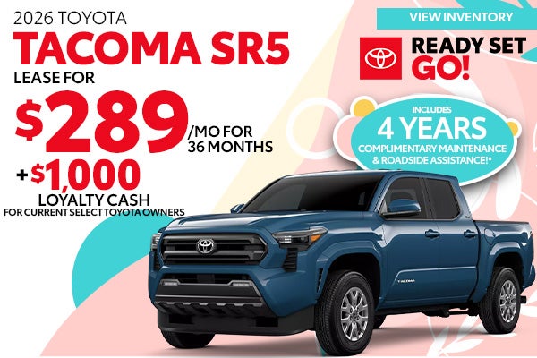 Lease example based on 2026 Tacoma 2WD Double Cab SR5 L4 8AT Model 7146 with Total SRP of $38,900. $4,288 Due At Signing includes $3,304 customer down payment, first month's payment of $289, and $695 Acquisition Fee. Tax, Title, Tags and $998 dealer fee not included in vehicle prices shown and must be paid by the purchaser. No security deposit required. $1,000 Tacoma Loyalty Cash offer entitles current Tacoma/Tundra/4Runner/Sequoia/Land Cruiser owners to $1,000 on the purchase or lease of a new 2024, 2025, or 2026 Tacoma [Gas Models]. This program applies to all Tacoma models, except Trail Hunter and TRD Pro models. Must lease or finance through SETF. Offer valid only at participating dealers in AL, FL, GA, NC and SC. Limit one per customer. No trade-in required. This offer is not transferable in any way. Vehicle must be retailed by 3/31/2026. For only very well qualified customers. Lessee responsible for maintenance, excess wear and use, and will pay $0.18 per mile for all mileage over 12,000 miles per year. $350 disposition fee is due at lease end. Cannot be combined with SETF Finance Cash, Down Payment Assistance, Trade-in Assistance, Customer Cash, APR, Finance Subvention Cash. Offer available in AL, FL, GA, NC, SC; void where prohibited Expires 3.31.36. *ToyotaCare covers all Toyota scheduled maintenance oil changes for the first 2 years you have your Toyota. After ToyotaCare expires, TOYOGUARD Platinum covers 2 synthetic oil changes and filters over the next 2 years.*