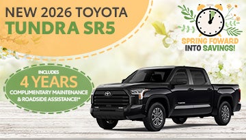 Tax, Title, Tags and $998 dealer fee not included in vehicle prices shown and must be paid by the purchaser. For only very well qualified customers. Terms available on approved credit through Southeast Toyota Finance at participating Toyota dealers. Not all customers qualify. Lease example based on 2026 Tundra 2WD Crew Max SR5 V6 10AT Model 8261 with Total SRP of $52,165. $5,438 Due At Signing includes $4,304 customer down payment, first month's payment of $439, and $695 Acquisition Fee. Tax, Title, Tags and $998 dealer fee not included in vehicle prices shown and must be paid by the purchaser. For only very well qualified customers. Security deposit required with exception of prior Southeast Toyota Finance (SETF) financing history and/or SETF credit rating in which a security deposit may be waived. Dealer contribution may vary and could affect lease payment. Individual dealer prices, other terms and offers may vary. Must lease from participating dealer's stock and terms are subject to vehicle availability. Lessee responsible for maintenance, excess wear and use, and will pay $0.18 per mile for all mileage over 12,000 miles per year. $350 disposition fee is due at lease end. Offer cannot be combined with SETF Finance Cash, Down Payment Assistance, Trade-in Assistance, Customer Cash, APR, Finance Subvention Cash. Offer available in AL, FL, GA, NC, SC; void where prohibited. Expires 5.04.26. See your participating Toyota dealer for details. *ToyotaCare covers all Toyota scheduled maintenance oil changes for the first 2 years you have your Toyota. After ToyotaCare expires, TOYOGUARD Platinum covers 2 synthetic oil changes and filters over the next 2 years.*
