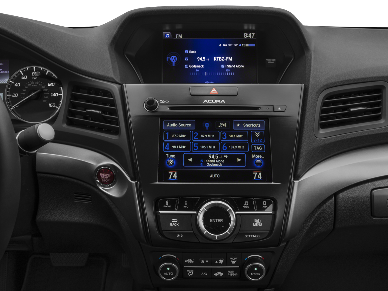 - Radio: Acura Premium Audio System -inc: 7 speakers, Siri Eyes Free, SMS/MMS text message and email capability, Bluetooth® HandsFreeLink wireless telephone interface, Pandora compatibility, USB audio interface w/iPod integration, Bluetooth® streaming audio, MP3/auxiliary input jack and Speed-Sensitive Volume Compensation (SVC), iPhone AcuraLink navigation app connectivity, On Demand Multi-Use Display (ODMD), Aha compatibility, HD Radio and SiriusXM satellite radio