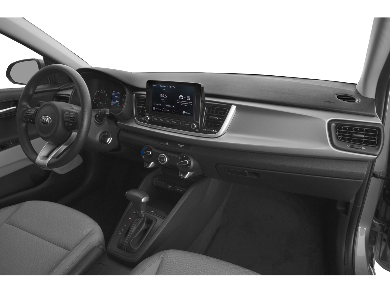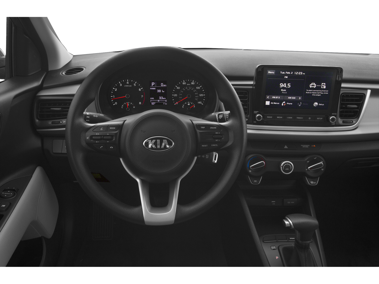 This vehicle comes equipped with : Black Cloth, 6 Speakers, ABS brakes, Air Conditioning, AM/FM radio, Apple CarPlay & Android Auto, Brake assist, Bumpers: body-color, Driver door bin, Driver vanity mirror, Dual front impact airbags, Dual front side impact airbags, Electronic Stability Control, Front anti-roll bar, Front Bucket Seats, Front Center Armrest, Front reading lights, Front wheel independent suspension, Fully automatic headlights, Heated door mirrors, Illuminated entry, Low tire pressure warning, Occupant sensing airbag, Outside temperature display, Overhead airbag, Overhead console, Panic alarm, Passenger door bin, Passenger vanity mirror, Power door mirrors, Power steering, Power windows, Radio: AM/FM/MP3 Audio System, Rear window defroster, Remote keyless entry, Speed control, Speed-sensing steering, Split folding rear seat, Steering wheel mounted audio controls, Tachometer, Tilt steering wheel, Traction control, Trip computer, Variably intermittent wipers, Wheels: 15" x 5.5J Steel w/Full Covers, and Woven Cloth Seat Trim.