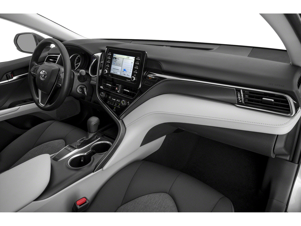 This Vehicle is nicely equipped with the following features: Camry LE, 4D Sedan, 2.5L I4 DOHC 16V, 8-Speed Automatic, FWD, Ice, Ash w/Fabric Seat Trim, 4-Wheel Disc Brakes, 6 Speakers, 7.5J x 17 Alloy Wheels, ABS brakes, Air Conditioning, Alloy wheels, AM/FM radio: SiriusXM, Apple CarPlay/Android Auto, Auto High-beam Headlights, Automatic temperature control, Brake assist, Bumpers: body-color, Delay-off headlights, Driver door bin, Driver vanity mirror, Dual front impact airbags, Dual front side impact airbags, Electronic Stability Control, Emergency communication system: Safety Connect (1-year trial), Exterior Parking Camera Rear, Fabric Seat Trim, Four wheel independent suspension, Front anti-roll bar, Front Bucket Seats, Front Center Armrest, Front dual zone A/C, Front reading lights, Fully automatic headlights, Illuminated entry, Knee airbag, Low tire pressure warning, Occupant sensing airbag, Outside temperature display, Overhead airbag, Overhead console, Panic alarm, Passenger door bin, Passenger vanity mirror, Power door mirrors, Power driver seat, Power steering, Power windows, Radio data system, Radio: Audio, Rear anti-roll bar, Rear seat center armrest, Rear side impact airbag, Rear window defroster, Remote keyless entry, Security system, Speed control, Speed-sensing steering, Split folding rear seat, Steering wheel mounted audio controls, Tachometer, Telescoping steering wheel, Tilt steering wheel, Traction control, Trip computer, and Variably intermittent wipers.