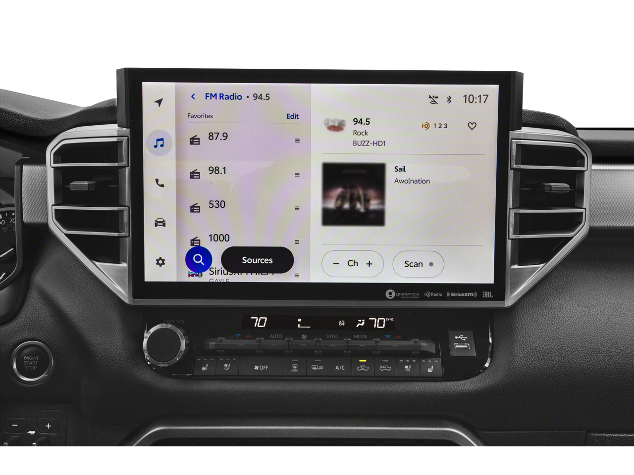 This vehicle comes equipped with: 20 x 8 Alloy Wheels, 3.31 Axle Ratio, 4-Wheel Disc Brakes, 9 Speakers, ABS brakes, Air Conditioning, Alloy wheels, AM/FM Radio, AM/FM radio: SiriusXM, Apple CarPlay/Android Auto, Auto High-beam Headlights, Auto-dimming door mirrors, Auto-dimming Rear-View mirror, Automatic temperature control, Brake assist, Bumpers: body-color, Delay-off headlights, Driver door bin, Driver vanity mirror, Dual front impact airbags, Dual front side impact airbags, Electronic Stability Control, Emergency communication system: Safety Connect (10-year trial), Exterior Parking Camera Rear, Front anti-roll bar, Front Bucket Seats, Front Center Armrest, Front dual zone A/C, Front fog lights, Front reading lights, Front wheel independent suspension, Fully automatic headlights, Garage door transmitter: HomeLink, Heated & Ventilated Front Bucket Seats, Heated door mirrors, Heated front seats, Illuminated entry, Knee airbag, Leather Shift Knob, Low tire pressure warning, Memory seat, Navigation System, Occupant sensing airbag, Outside temperature display, Overhead airbag, Overhead console, Panic alarm, Passenger door bin, Passenger vanity mirror, Power door mirrors, Power driver seat, Power passenger seat, Power steering, Power windows, Radio data system, Rear reading lights, Rear seat center armrest, Rear step bumper, Rear window defroster, Remote keyless entry, Security system, SofTex Seat Trim, Speed control, Speed-sensing steering, Split folding rear seat, Steering wheel mounted audio controls, Tachometer, Telescoping steering wheel, Tilt steering wheel, Traction control, Trip computer, Turn signal indicator mirrors, Variably intermittent wipers, Ventilated front seats, and Voltmeter.